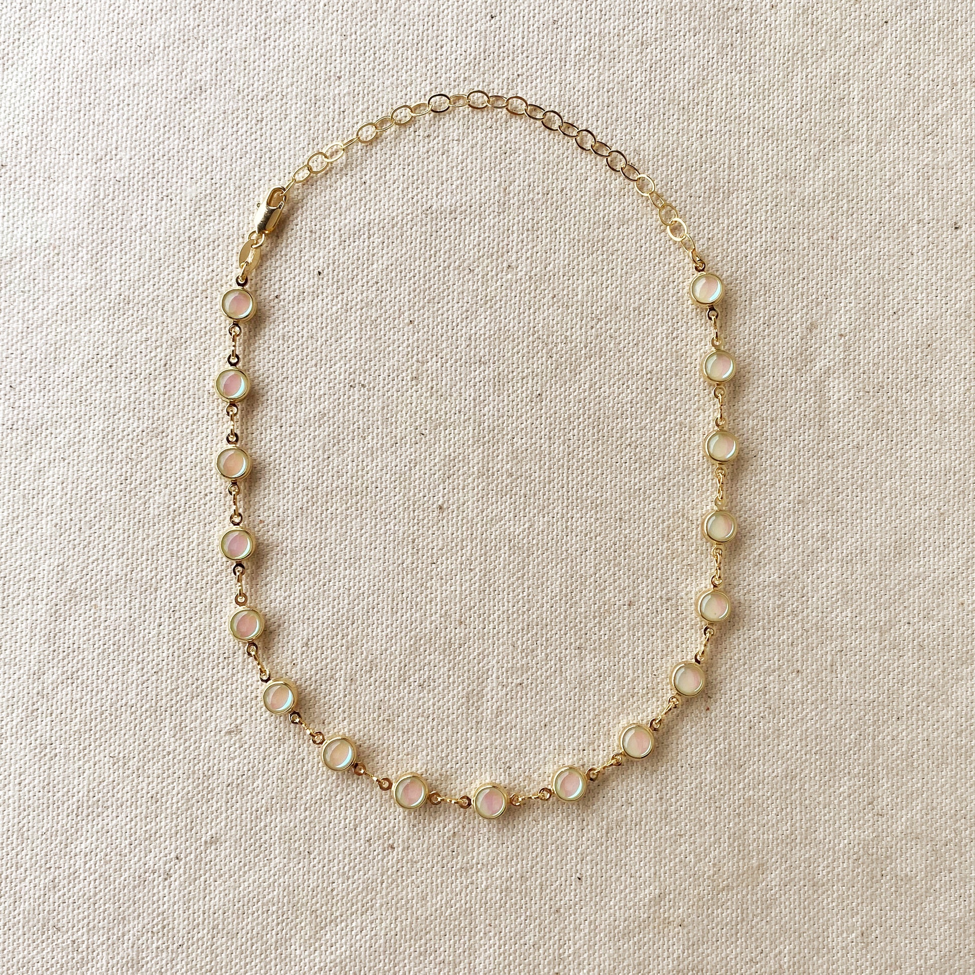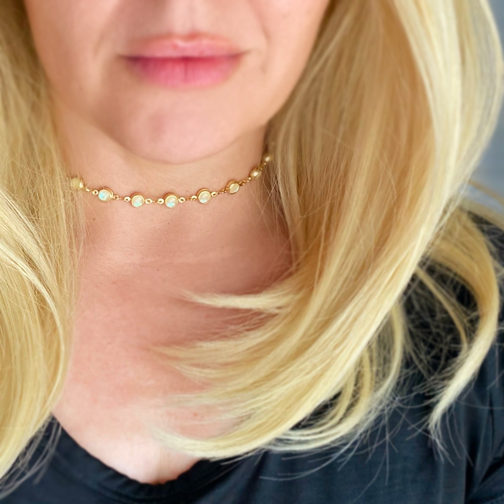 Introducing our gorgeous, 18k gold filled rounded opal choker - perfect for this summer season. Make a statement and look as trendy as ever with this choker that will be sure to turn heads. Embrace the summer with this stunning fashion accessory!