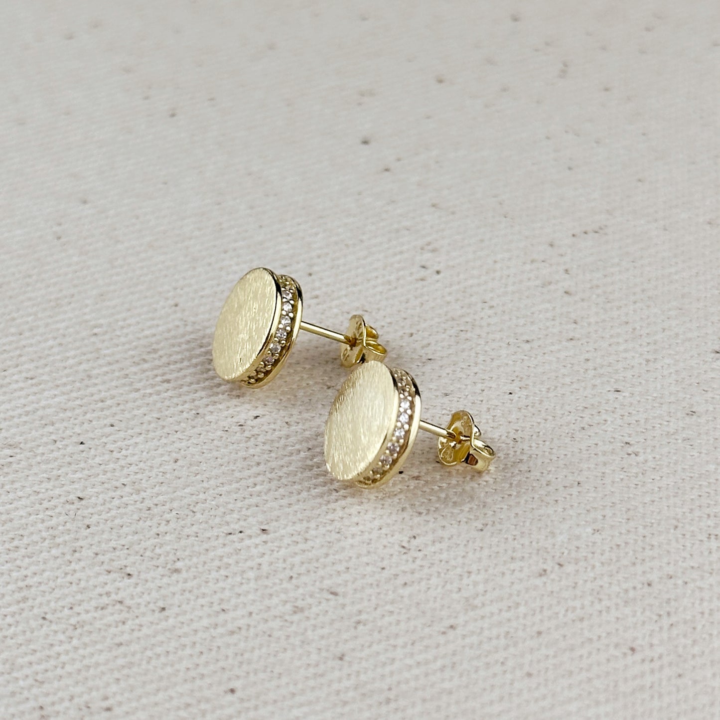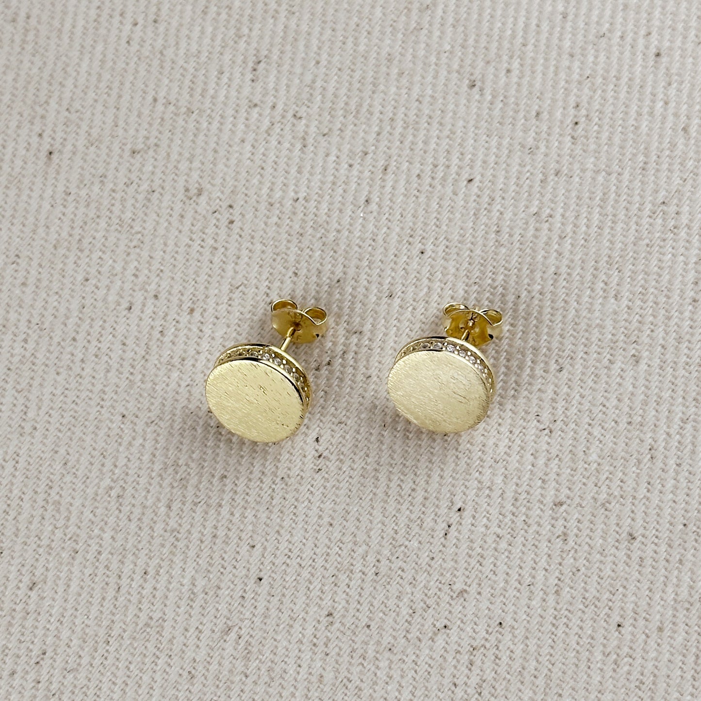 18k Gold Filled Brushed Button Stud Earrings With CZ Detail
