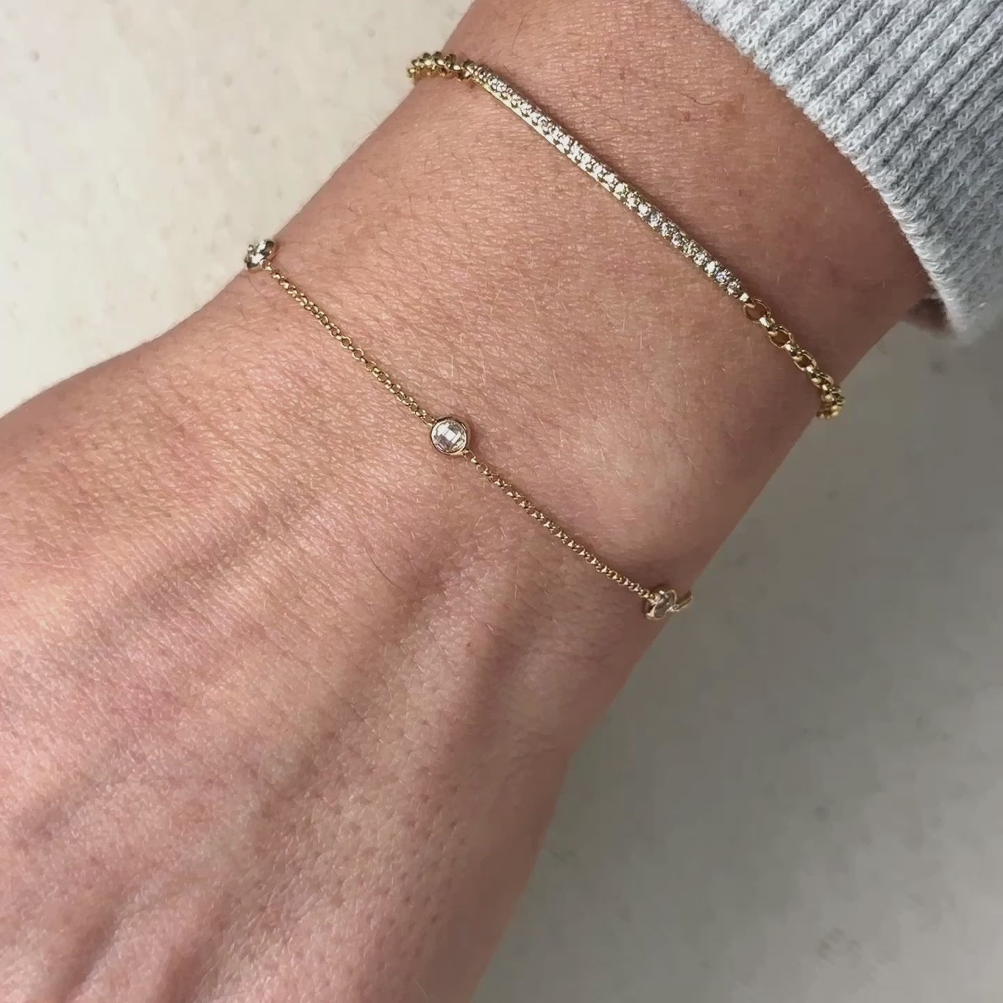 Get ready to shine with our 18k Gold Filled CZ Bezel Bracelet! This minimalist piece features a sparkly CZ bezel, adding a touch of elegance to any outfit. Treat yourself or a loved one to this stunning bracelet and make a statement anywhere you go!