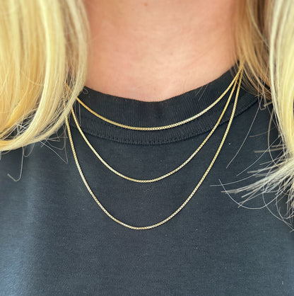 This classic and elegant 1mm box chain is perfect for adding a touch of glamour to your favorite outfit. Its subtle design will make any look shine. Layer it with other necklaces or add your favorite charm for pure perfection!