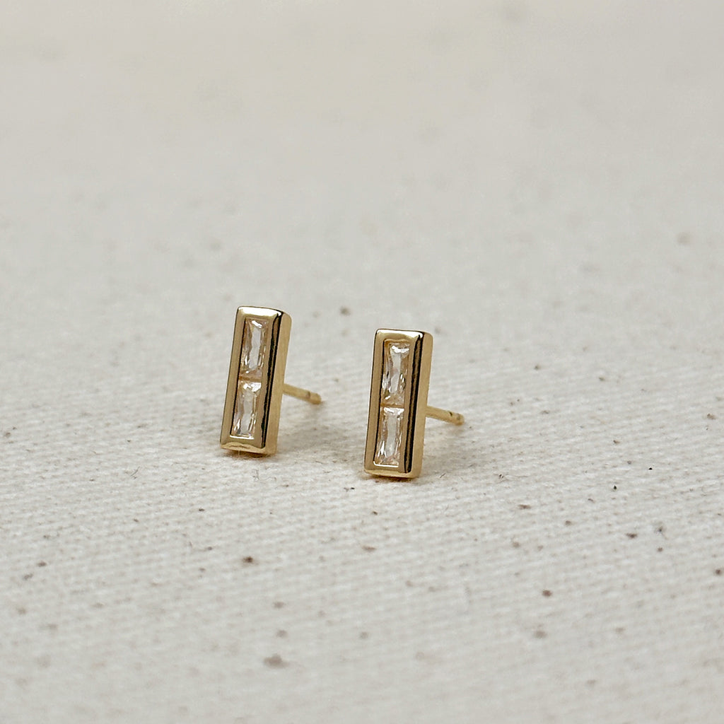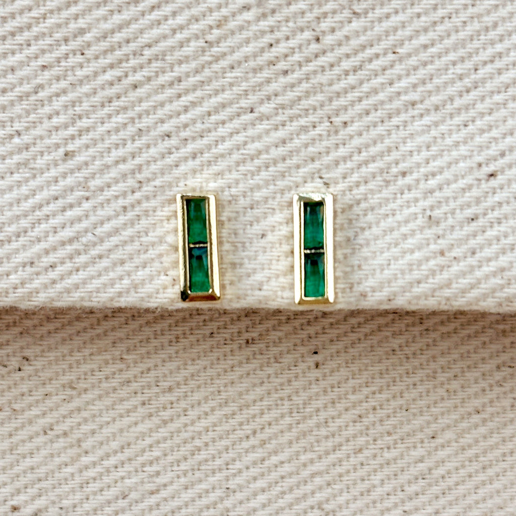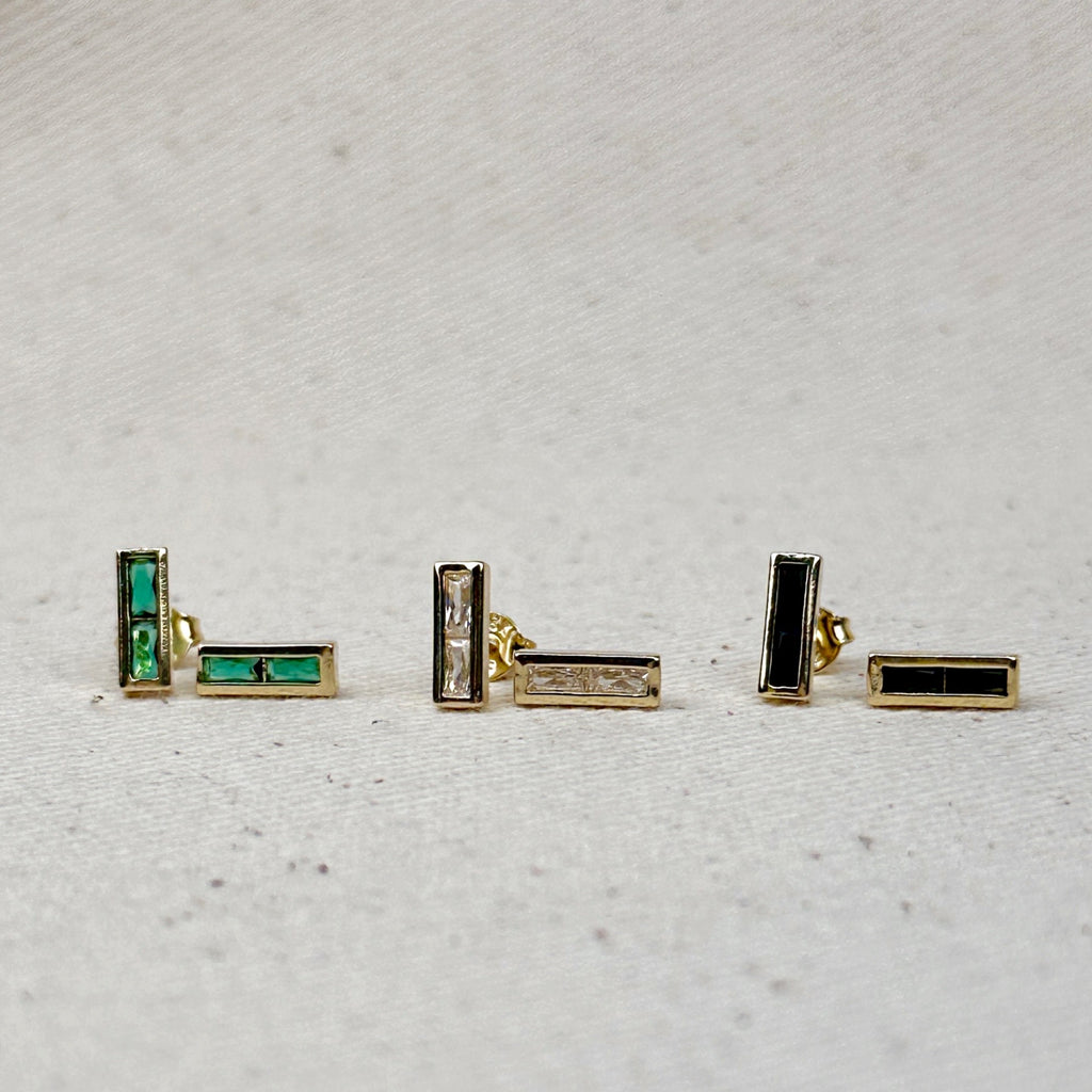 Introducing the exquisite 18k Gold Filled Colored Split Baguette Stud Earrings, available in Clear, Black, and Emerald. These stunning earrings feature a sophisticated design that combines classic elegance with contemporary flair, perfect for any occasion.