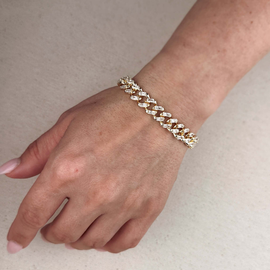 Indulge in luxury with our 18k Gold Filled Iced Chunky Cuban Bracelet. The sparkly, glamorous design will elevate any outfit, making you feel like a true fashion icon. Treat yourself or a loved one to the ultimate statement piece.