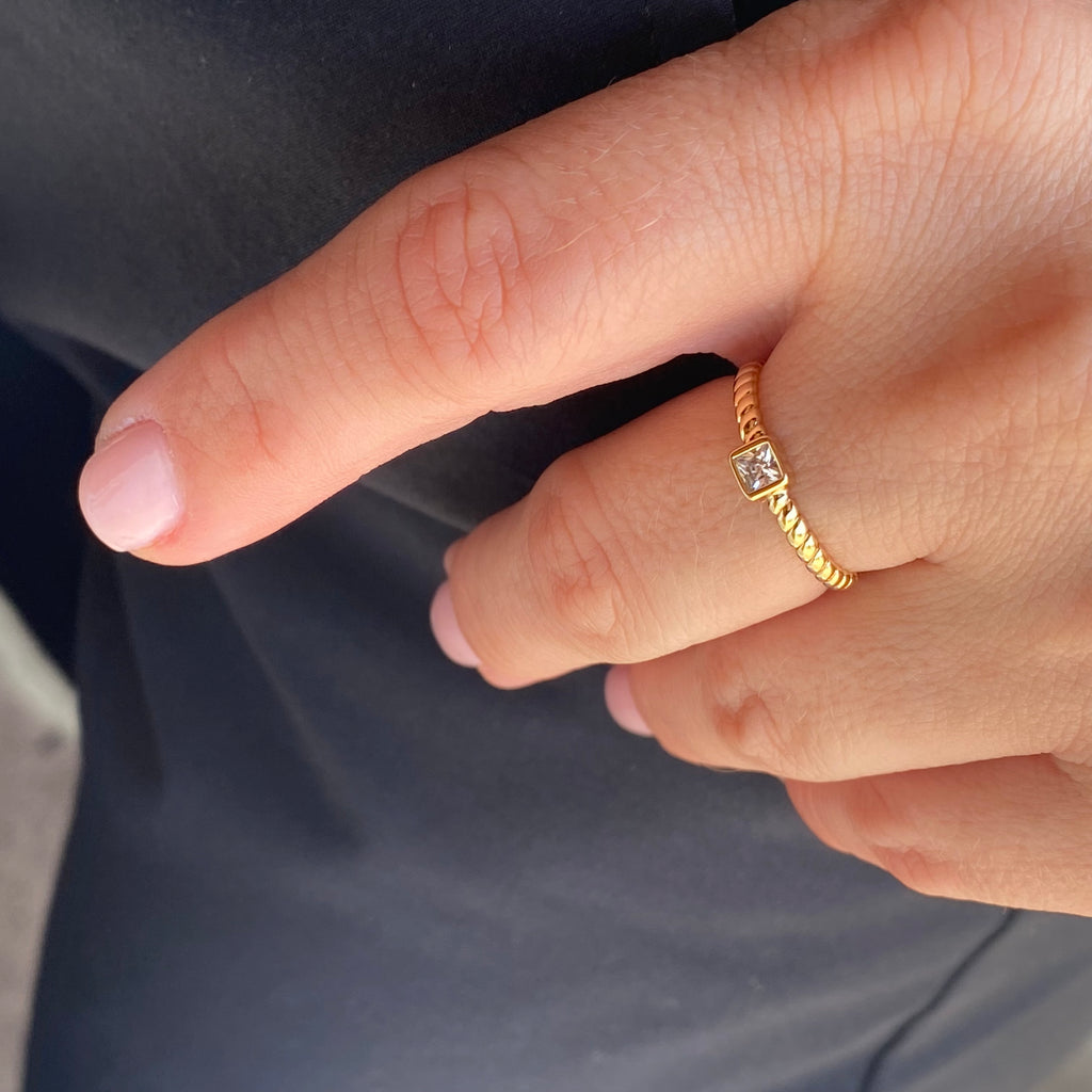 Elevate your style with this exquisite 18k gold-filled twisted solitaire band that features a stunning cubic zirconia stone for a pop of sparkle. This ring's intricate and delicate minimalist design exudes elegance and sophistication, making it the perfect accessory for any occasion. Make a statement with this dainty and beautiful piece that will add the perfect finishing touch to any outfit.