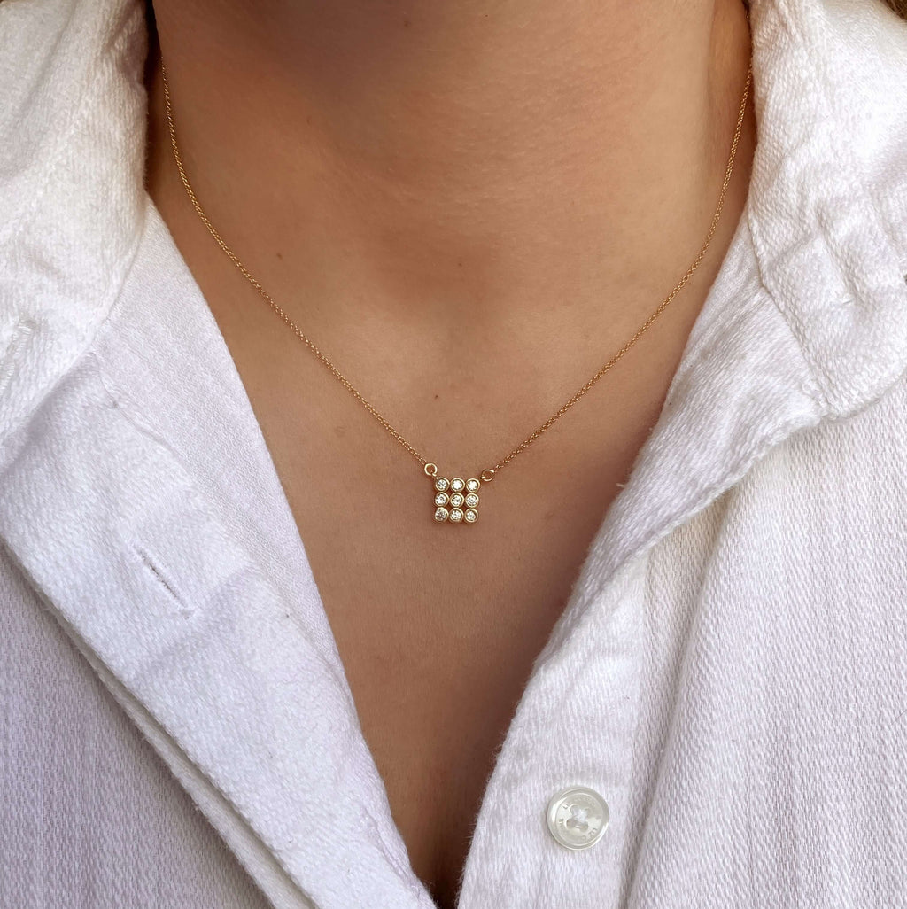 Delicate sophisticated 18k Gold filled necklace featuring a 3x3 cluster with bezel Cubic Zirconia stones. Dainty minimalist style to glow your personality.