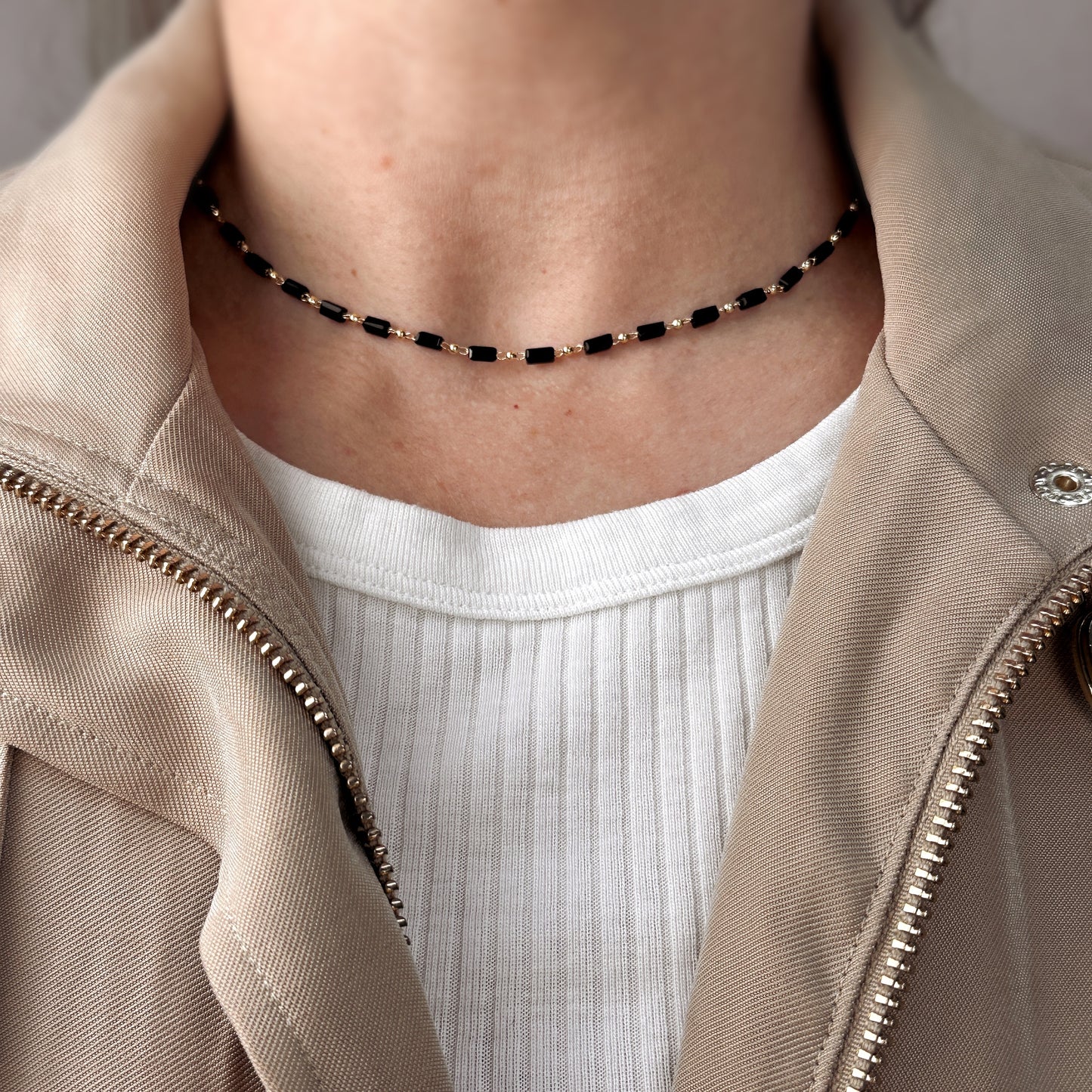 18k Gold Filled 2 mm Black Baguette & Beads Necklace